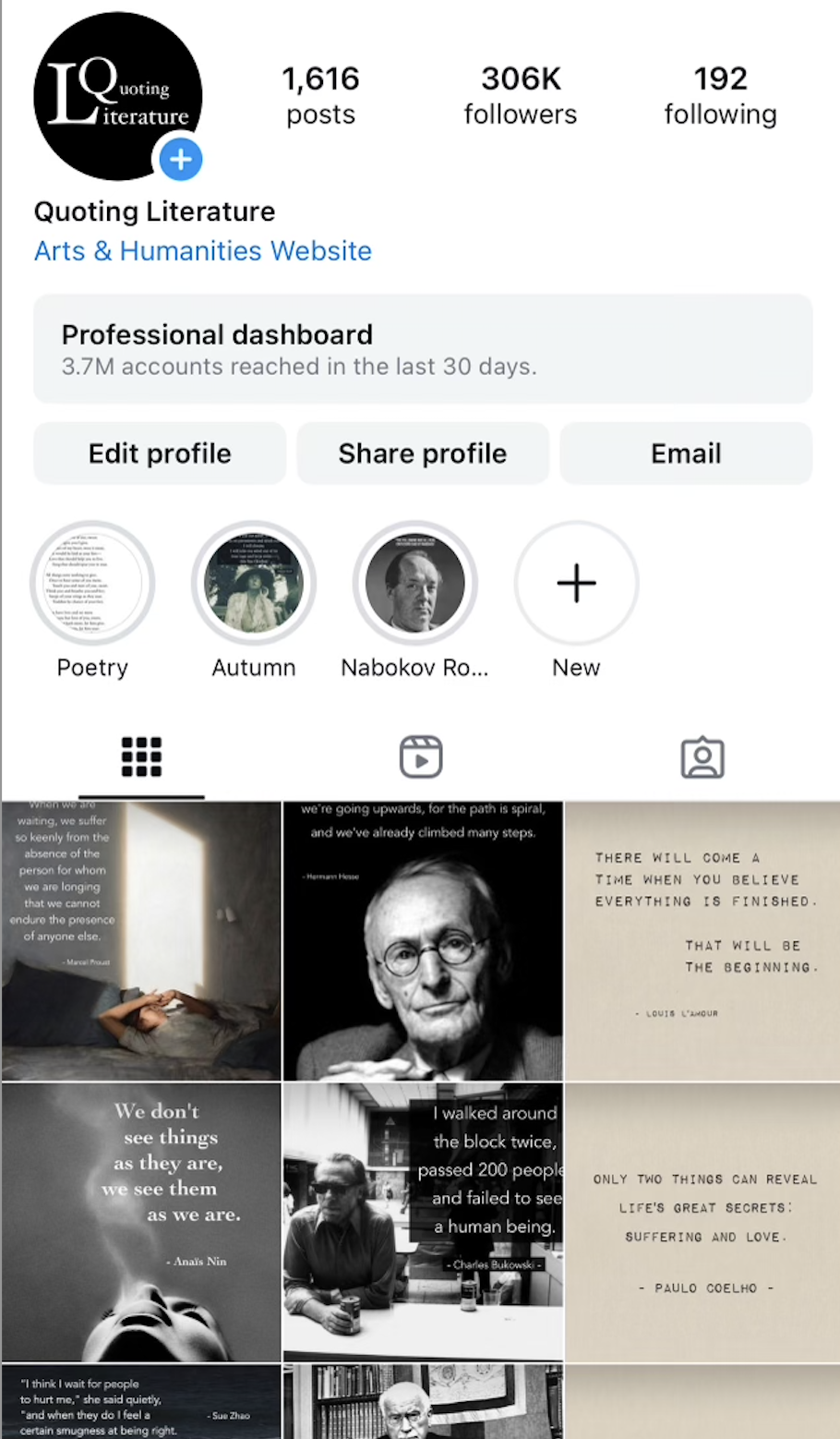 I founded Quoting Literature and meticulously developed it, crafting every book review, designing every visual, creating all posts, and managing every promotion. Through dedication and passion, I grew the account from zero to over 300,000 followers. Today, Quoting Literature reaches almost 4 million accounts monthly and collaborates regularly with writers, artists, and the world's largest publishing houses.