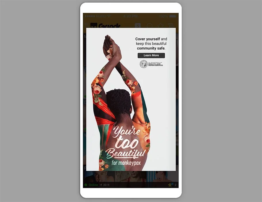 The image to the right represents a full screen interstitial ad on Grindr. When the user is scrolling through potential men to be intimate with, the message “You’re too beautiful for monkeypox” would affirm while also giving them pause and encourage vaccination before high-risk behavior.