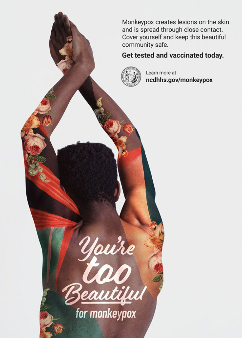 Amid a growing Monkeypox outbreak, North Carolina needed to swiftly bring awareness to vaccinations and encourage safe behaviors. Our campaign paired visually striking art that highlighted the impact of Monkeypox on the body with messaging that appealed to beauty and self-worth.